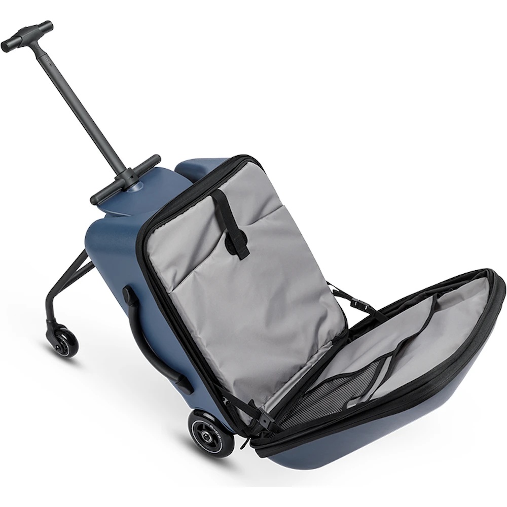 Ride On Luggage Eazy Weekender combină trei caracteristici practice într-un singur produs: troller cu scaun pentru copii, bagaj de mână și cărucior.