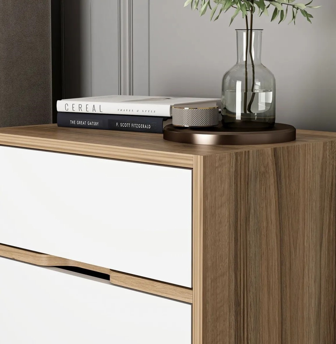 Fabricată din panouri de particule acoperite cu 100% melamină, această noptieră este construită pentru a dura. Grosimea de 18 mm asigură robustețe și stabilitate, oferind o piesă de mobilier de încredere care va rezista testului timpului.