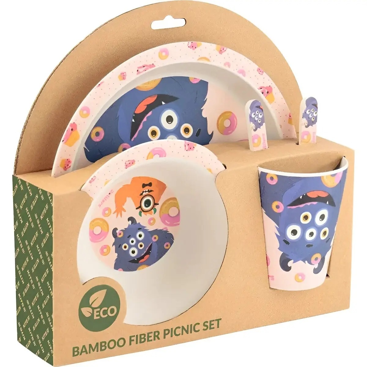- Setul constă din cinci piese: farfurii adânci și plate, cană, lingură și furculiță.