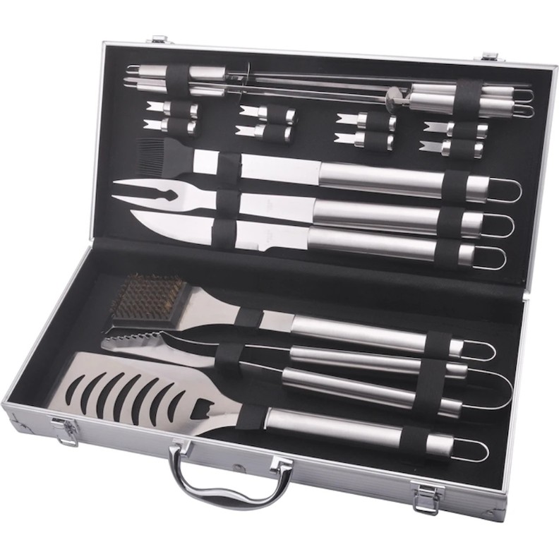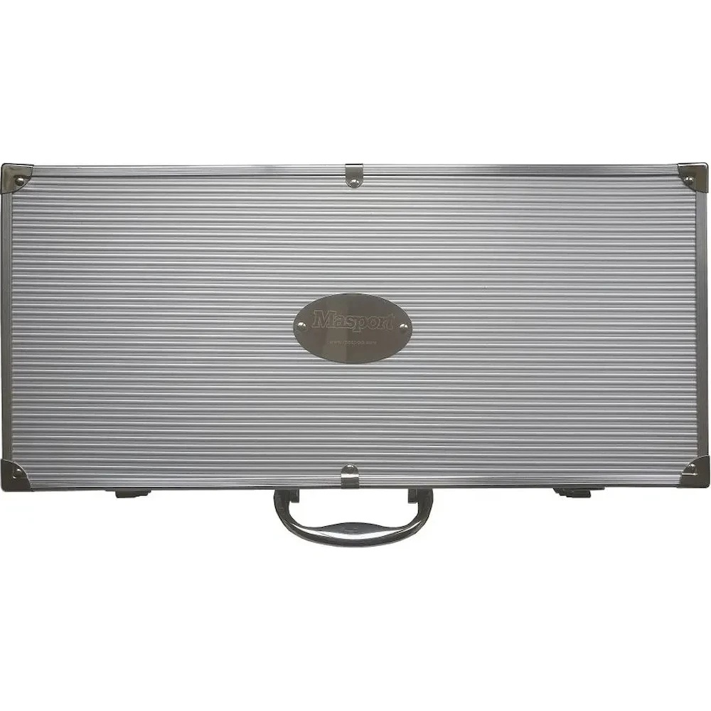 Set gratar AL-KO Masport Stainless 134218 — fabricat din otel inoxidabil. Valiza robusta de transport din aluminiu. Include: cutit, furculita, cleste, spatula, perie, razuitor pentru gratar / perie suplimentara, 4 tepuse si 8 suporturi pentru stiuleti de porumb.