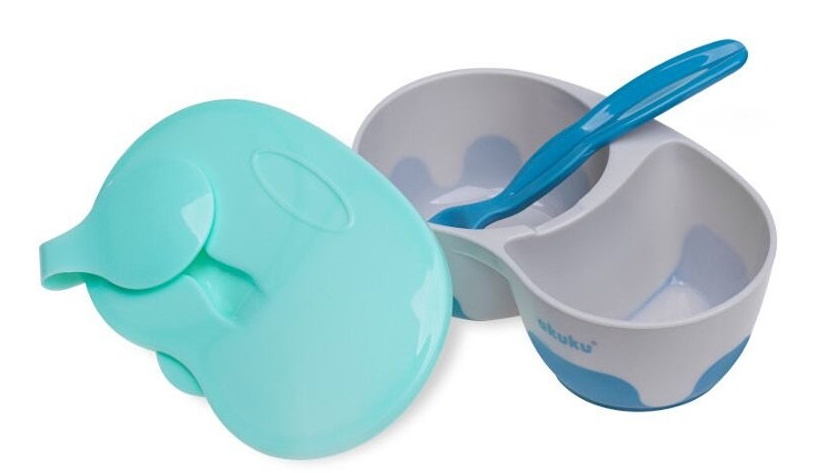 Vasul practic cu două camere este un produs care vă va fi la îndemână la plimbare sau într-o excursie. Două camere vă permit să împărțiți mesele. Are fund anti-alunecare. Capacul ceștii are un atașament special pentru o lingură profilată - servește și ca capac. Lingura moale nu va irita gingiile delicate ale bebelusului, marimea si forma acestuia sunt adaptate gurii bebelusului. Fabricat în întregime din materiale sigure concepute pentru contactul cu alimentele, fără BPA (0% BPA). Nu folosiți capacul când încălziți în cuptorul cu microunde.