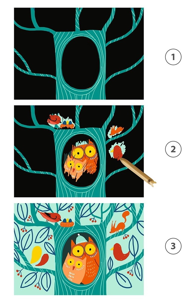 In set5 plăci de zgâriat (21 x 28 cm), 1 mâner din lemn cu vârf rotunjit, 1 broșură cu instrucțiuni pas cu pas