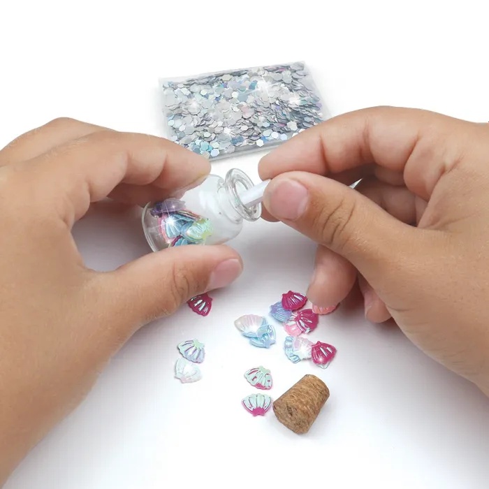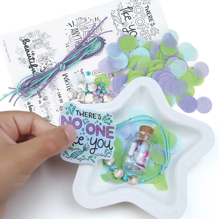 In set10 stele de hârtie, 5 sticle mini, 2 sticle de vopsea, cutie de cerneală pulverizată, 4 pagini de citate inspiraționale, pudră sclipitoare și strălucitoare, confetti de hârtie, tub de lipici, 40 de margele și 5 șnururi, pagină de autocolante, pensulă, bag