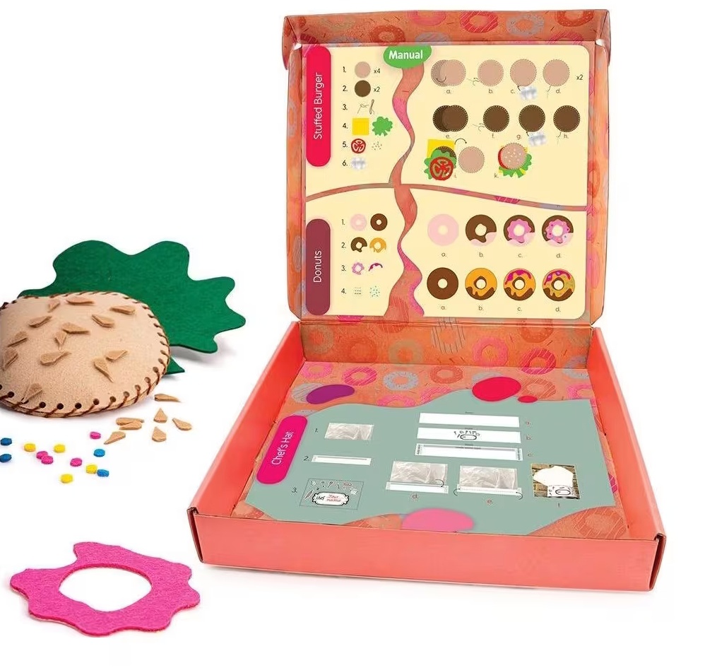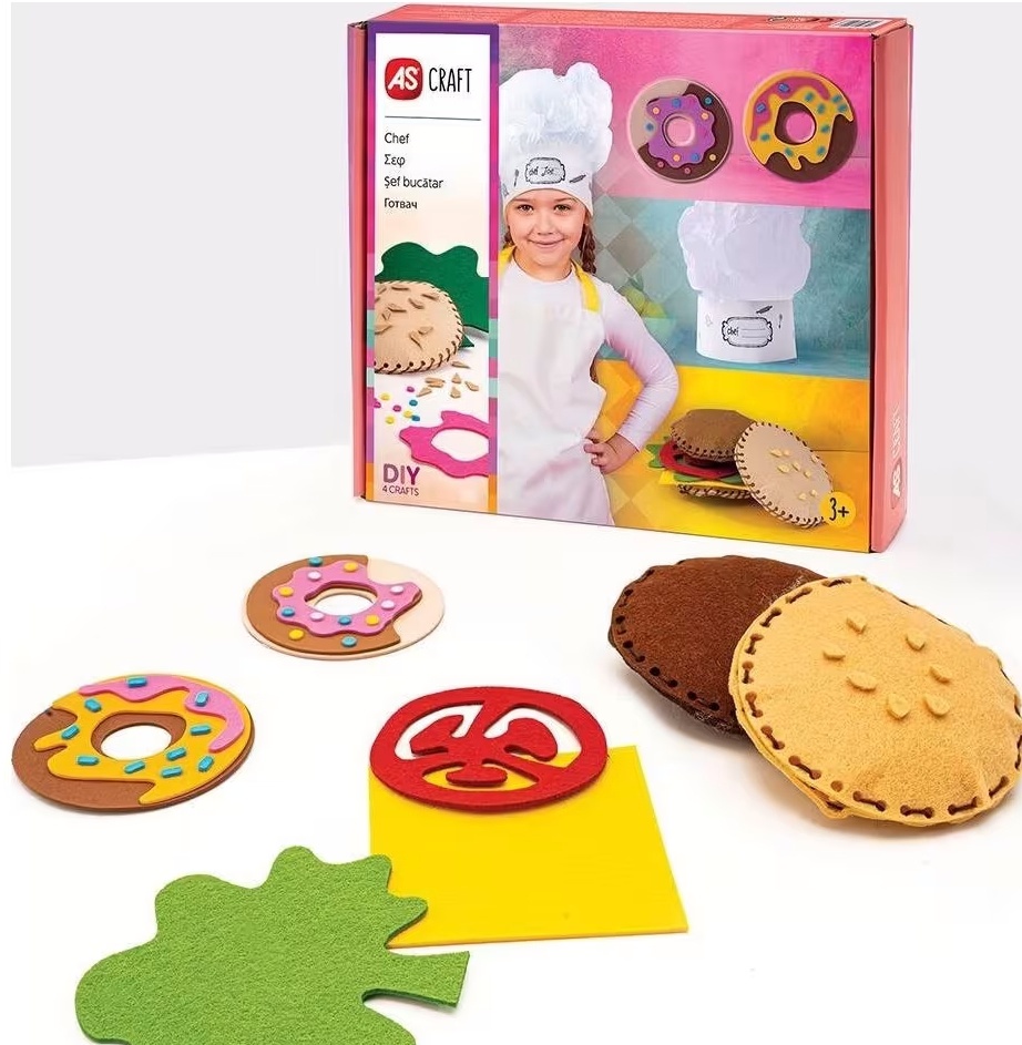 Creează-ți propriile obiecte de artizanat și simte-te ca un adevărat bucătar în bucătăria ta. Pălărie de bucătar, pahar cu gogoși și burger delicios, special fabricate din materiale sigure și moi pentru joaca creativă a copiilor. Meșteșuguri DIY: - 1 pălărie de bucătar - 2 pahar cu gogoși - 1 burger delicios *Meșteșugurile AS au un element puternic de joc de rol, deoarece toate includ meșteșuguri pe care copilul le poate purta imediat ce le termină.