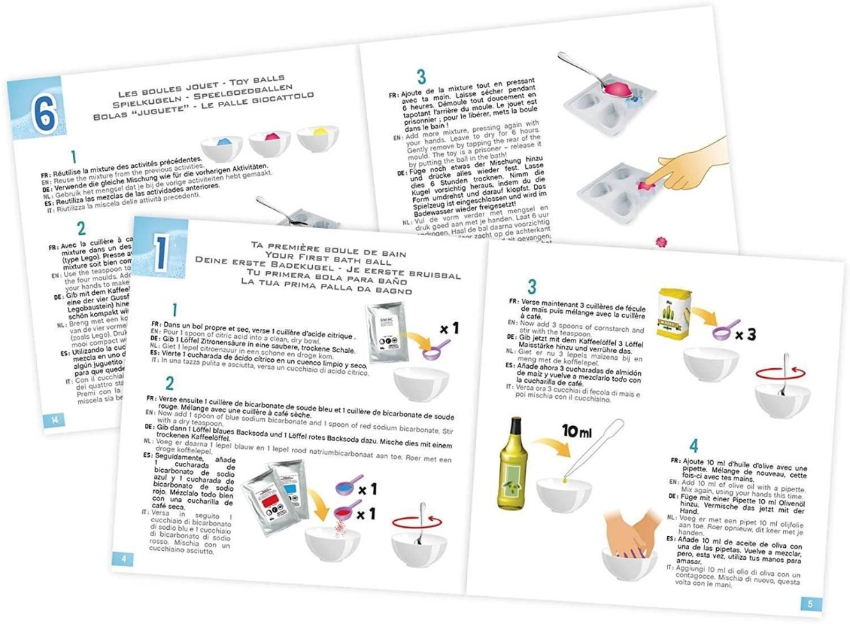 In setbicarbonat de sodiu rosu, bicarbonat de sodiu galben, bicarbonat de sodiu albastru, acid citric, 2 pipete, lingura, matrita de turnare