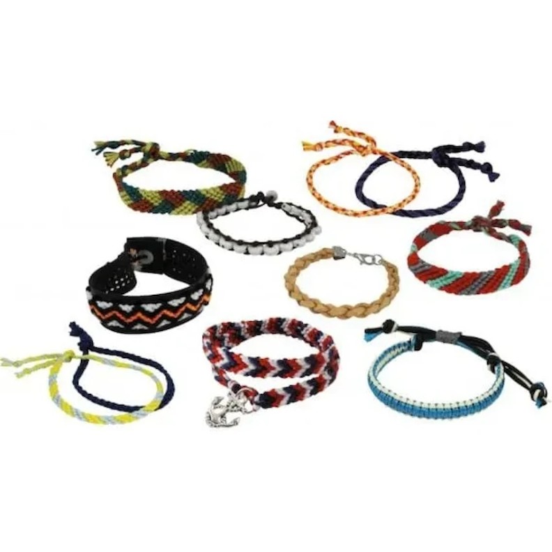 Setul include diverse accesorii: fire de bumbac, fire cerate, talismane si o bratara din piele ecologica.