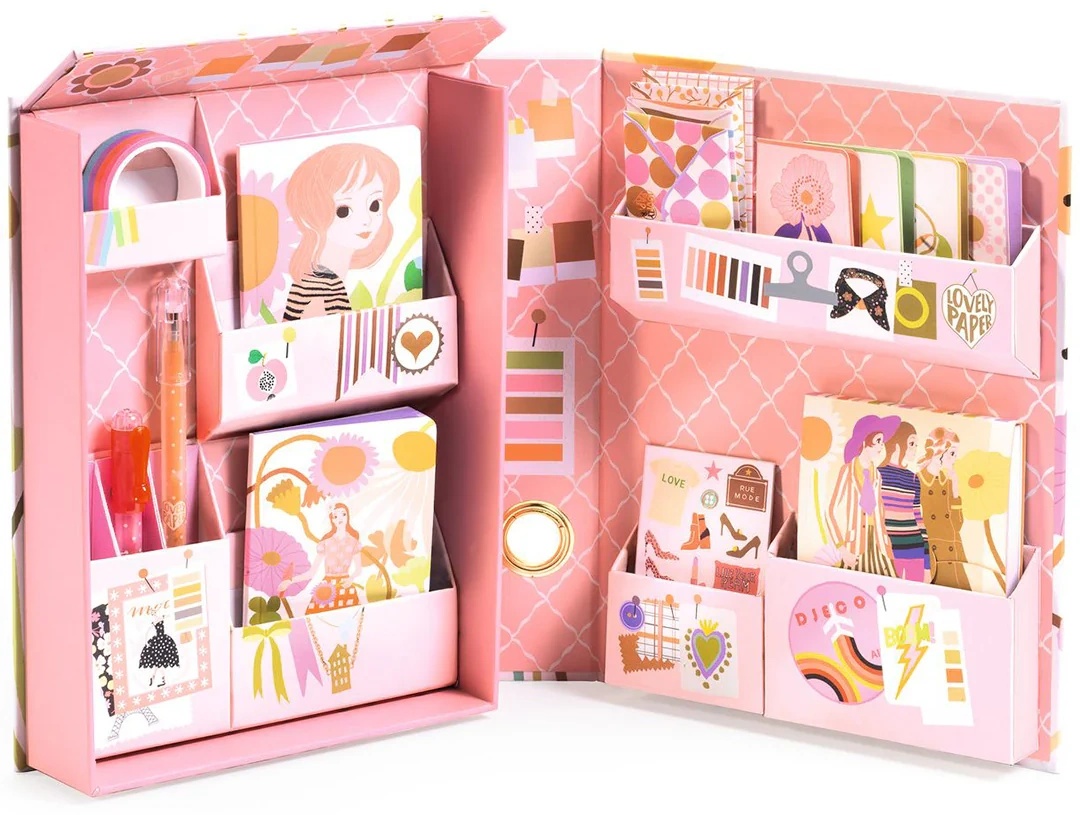 Djeco DD03507 este un set complet de papetărie, prezentat sub forma unei armoiere‑carte care se deschide cu mai multe compartimente pentru organizarea tuturor accesoriilor creative. Este ideal pentru copiii care iubesc să scrie, să decoreze și să își exprime ideile în proiecte artistice și de jurnalizare.