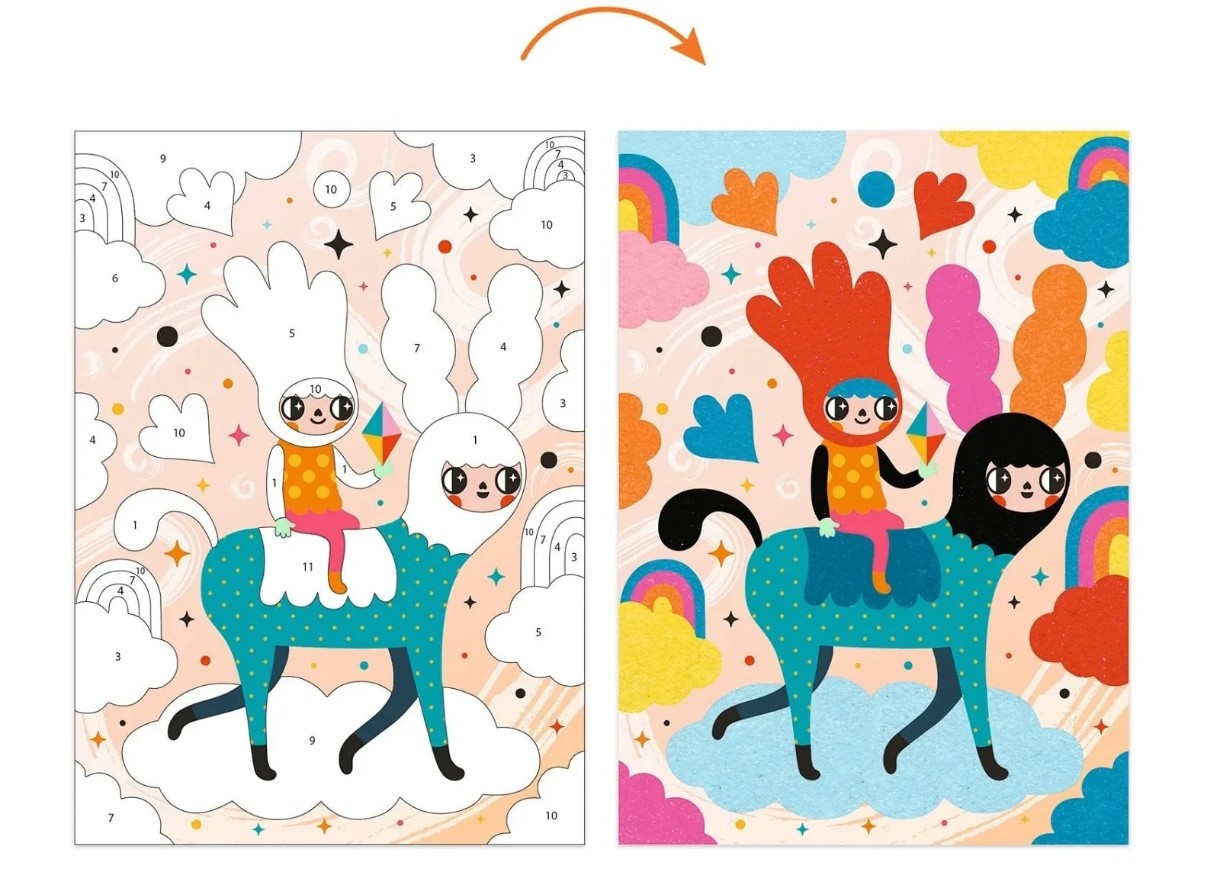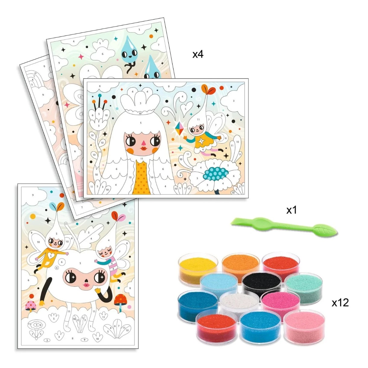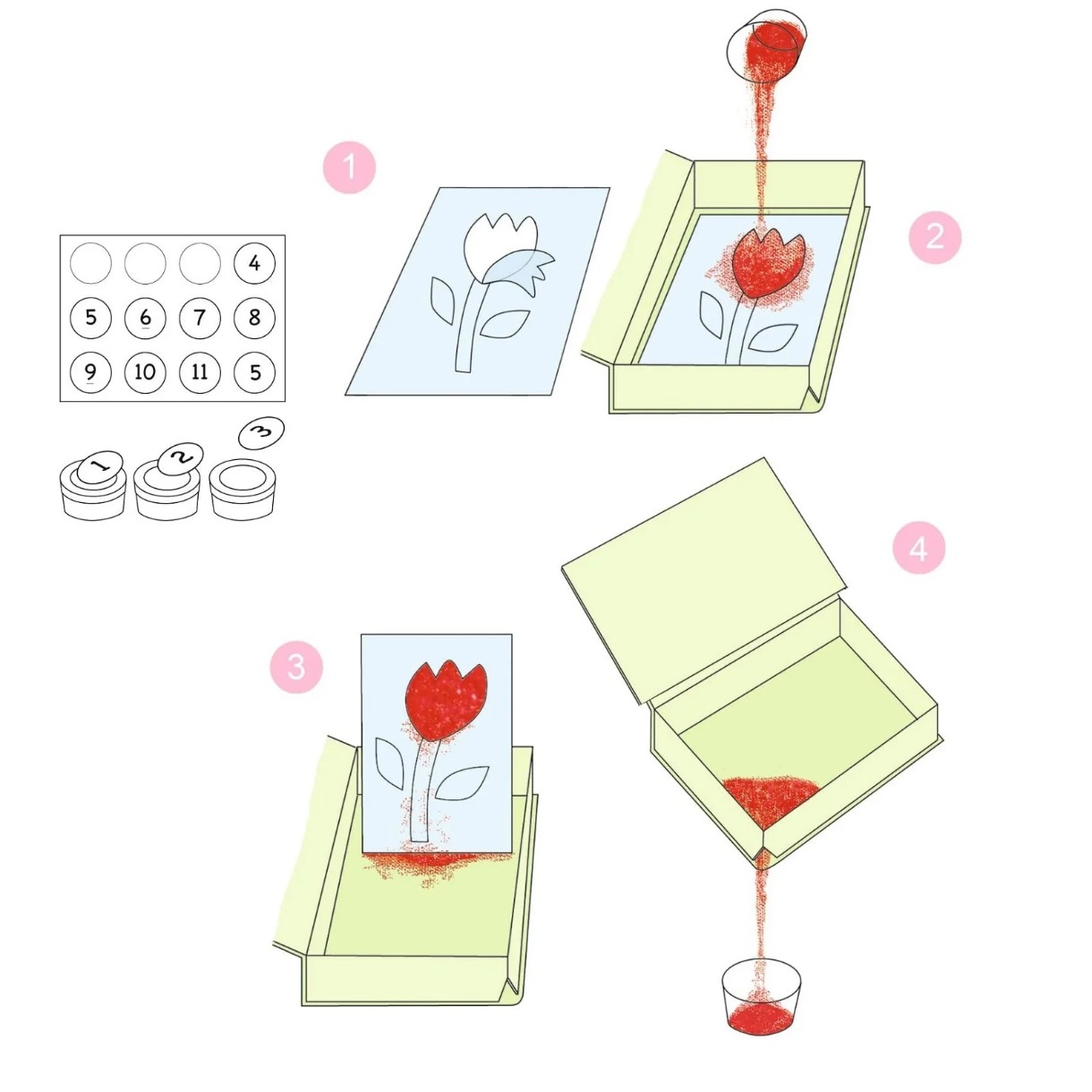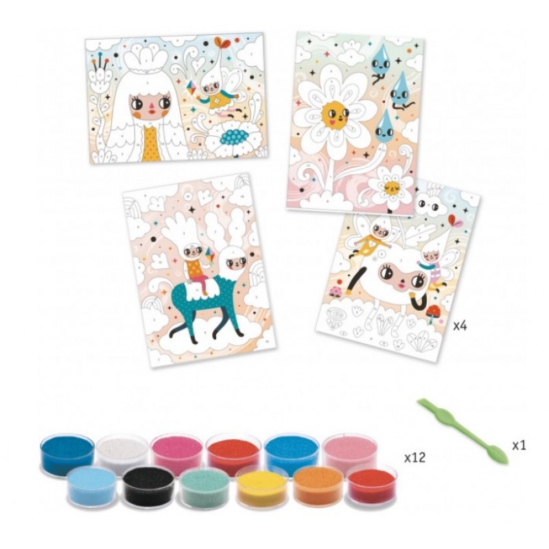In set4 carduri pentru decor, 12 recipiente cu nisip de diferite culori, 1 stilou din plastic, instructiuni