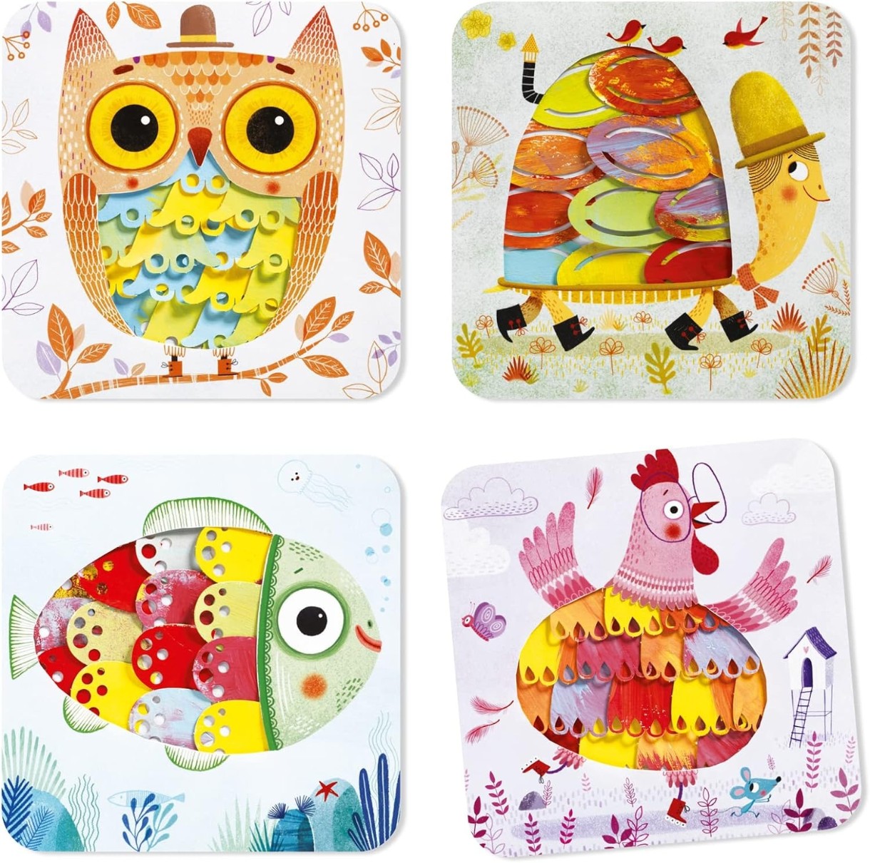 In set4 șabloane, 3 bureți de pictat, 4 borcane cu vopsele, elemente decorative, bețișoare de lipici, instrucțiuni cu poze