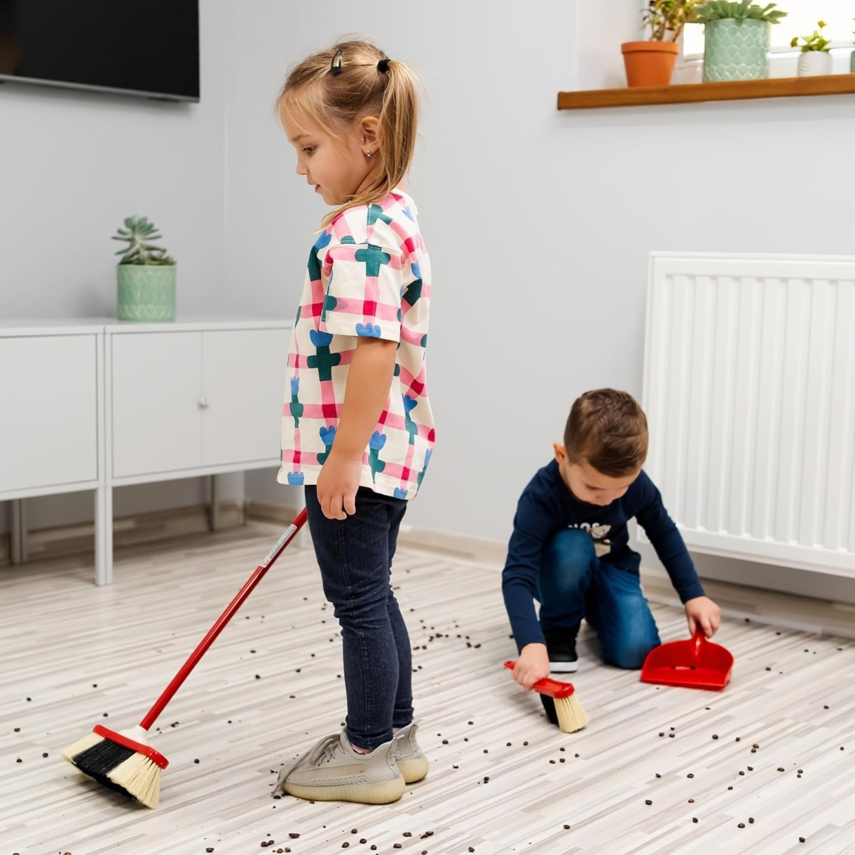 Cu această mătură cool în alb-negru șic, micuții ajutoare ocupați mătură praful și firimiturile, le strâng în făraș cu mătura de mână și pun totul la loc rapid. Acest set de curățenie de la Theo Klein face totul cu adevărat distractiv, deoarece setul de electrocasnice este perfect adaptat jocurilor și mâinilor copiilor, are un aspect modern și provine dintr-o tradiție îndelungată, înrădăcinată în calitate și durabilitate.
