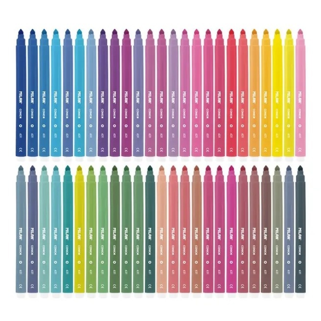 Carioci cu vârf conic de 5 mm Ø. Poate fi folosit pentru a crea curse de la 0,75 mm la 3 mm. Varful este rezistent la lovituri si presiune. Vopsea pe bază de apă care creează culori strălucitoare, ușor de aplicat, care pot fi amestecate împreună. Cel mai bine este să folosiți acest tip de vârf pentru a umple suprafețele cu culoare. Poate fi spălat cu ușurință din majoritatea țesăturilor (înmuiați articolul în apă rece timp de o oră și apoi spălați-l la mașină la rece). Cu capac de siguranță perforat. 50 de culori. Carcasă rigidă cu design pentru copii.
