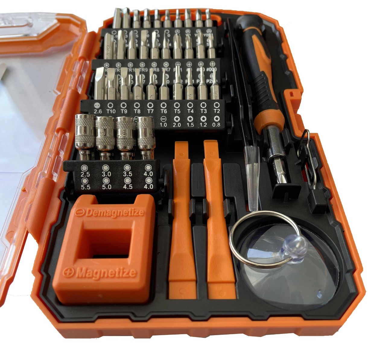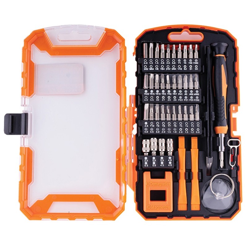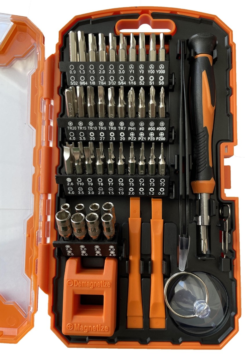YJTS-3018 Set de reparații de telefoane inteligente de lux de 77 buc. CONȚINUT: 1 buc mâner de șurubelniță de precizie 1 buc rachete, 1 buc Mangetizer / Demangetizer 1 buc alegere de deschidere trigonală, 1 buc deschizător de tavă pentru cartela SIM 1 buc ventuză, 2buc mini bară de ridicare 8 prize mini 28mm : 2,5, 3,0, 3,5, 4,0, 4,5, 5,0, 5,5 mm 6 buc fante: 1.0, 1.5, 2.0, 3.0, 3.5, 4.0mm mm 5 buc phillips: PH000, PH00, PH0, PH1, PH2 , 4 buc Pozi : PZ00, PZ0, PZ1, PZ2 8 buc hexagonale (metrice): 0,9, 1,3, 1,5, 2,0, 2,5, 3,0, 3,5, 4 mm ; 7 buc hexagonale (SAE): 1/16 "", 5/64"", 3/32 "", 7/64"", 1/8 "", 9/64"", 5/32 ""; 9 buc Torx : T2, T3, T4, T5, T6, T7, T8, T9, T10; 6buc Torx rezistent la manipulare: TT7, TT8, TT9, TT10, TT15, TT20; 3 buc pătrat: S0, S1, S2, 4 buc Triunghi: TA20, TA23, TA27, TA30; 4 buc Pentalobe: 0,8, 1,2, 1,5, 2,0 mm 4 buc tri-aripi: Y000, Y00, Y0, Y1 1 buc cheie : SP6 MATERIAL: CR-V6150 SUPRAFAȚĂ: Finisaj nichel Pachet: Etichetă color + shrink Interior / Master: 6 / 24buc
