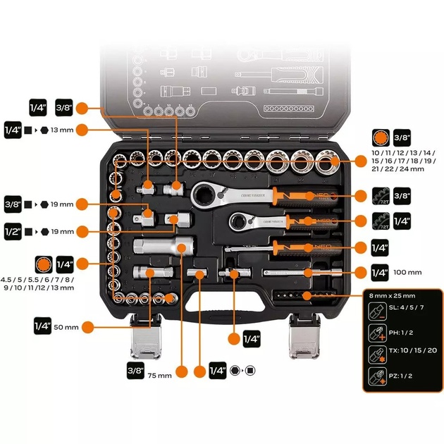 Tipul de capete1/4": 4.5, 5, 5.5, 6, 7, 8, 9, 10, 11, 12,13. 3/8 ": 10, 11, 12, 13, 14, 15, 16, 17, 18, 19, 21, 22, 24