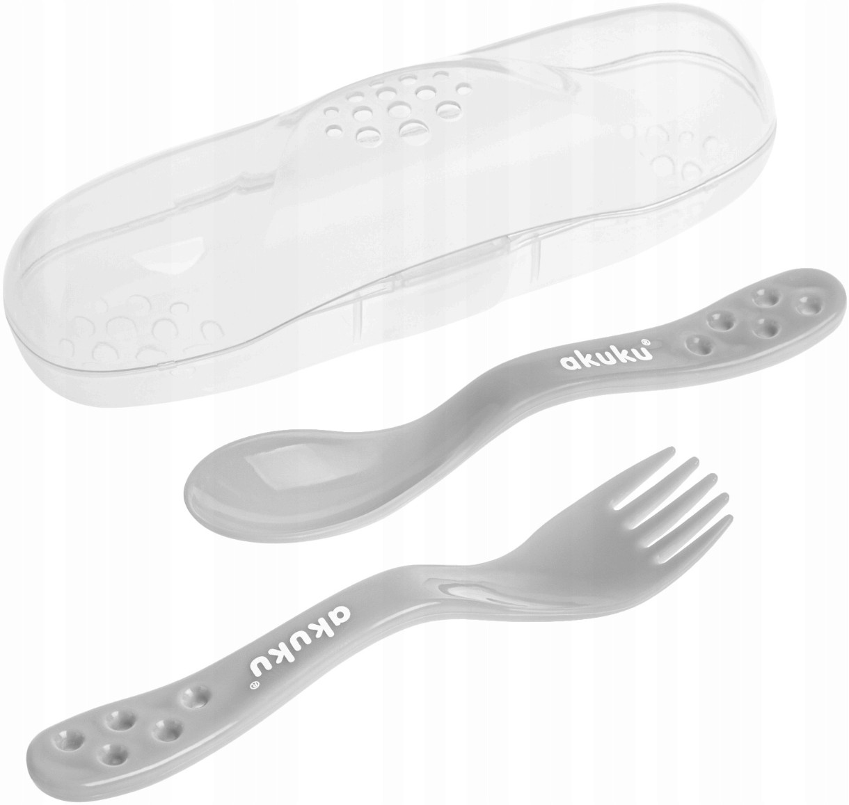 Set tacâmuri modelate: furculiță și lingură. Echipat cu o carcasă practică, datorită căreia se vor dovedi în afara casei - la plimbări și pe drum. Fabricat din materiale sigure, de înaltă calitate, destinate contactului cu alimentele. Formele rotunjite ale tacâmurilor sunt potrivite pentru gingiile delicate ale unui copil mic. Produsul este complet lipsit de bisfenol A (0 BPA).
