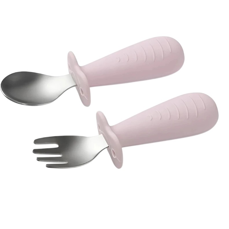 - Lingurița și furculița din oțel inoxidabil sunt rezistente și durabile. Mânerele din silicon alimentar fără BPA previn alunecarea din mâna copilului. Tacâmurile vor fi folosite timp îndelungat.
