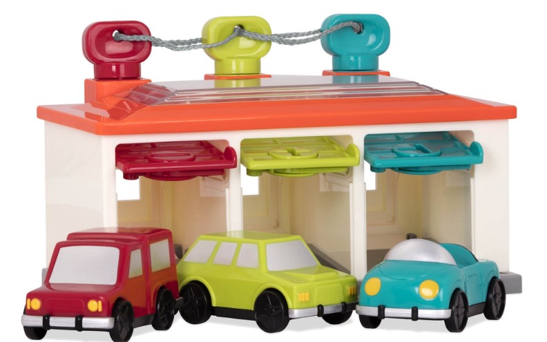 Un set de joacă colorat cu garaj conține 3 mașini de jucărie și 1 set de 3 chei