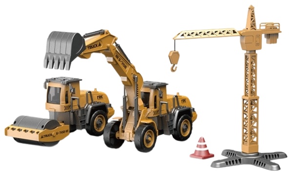 Este cadoul perfect pentru micii constructori! Setul conține vehicule de construcții realiste: excavator, cilindru compactor și macara, precum și accesorii (con, pietre etc.). Vehiculele sunt echipate cu efecte sonore și luminoase: sunet de mers înapoi, claxon, sunet de motor și sunet de macara în funcțiune. Unele părți sunt mobile – se poate săpa, ridica și transporta „încărcături”, ca pe un adevărat șantier. Dezvoltă imaginația, coordonarea și motricitatea fină.