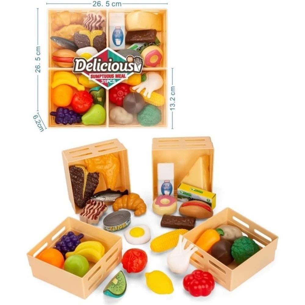 Setul de joaca cu 4 ladite, este perfect pentru micii bucatari in devenire! Acest set contine 32 de elemente, care includ fructe, legume, delicii si alimente, toate perfect detaliate si colorate. Fiecare lada este incarcata cu o varietate de alimente, stimuland imaginatia copiilor si incurajandu-i sa isi creeze propriile jocuri de gatit sau cumparaturi. Acest set este ideal pentru dezvoltarea abilitatilor motorii fine, recunoasterea culorilor si a formelor, si pentru invatarea despre alimentele sanatoase.