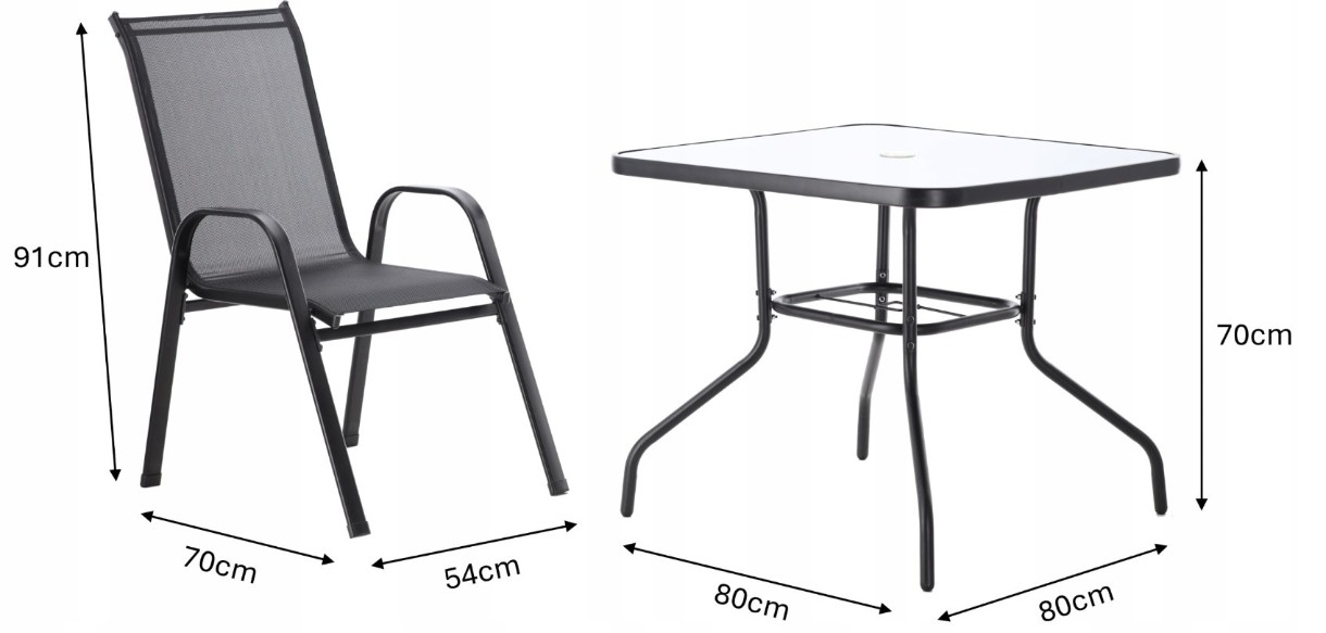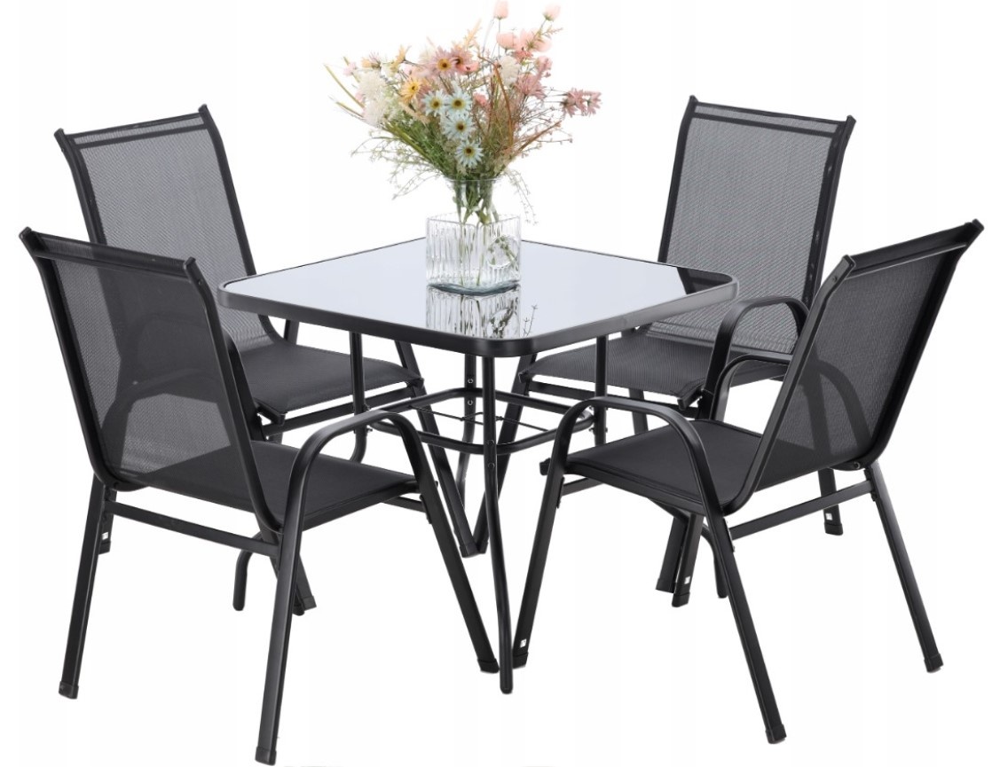 Setul este format din patru scaune confortabile și o masă pătrată solidă. Totul este realizat într-o culoare neagră clasică, care adaugă stil și eleganță oricărui spațiu.