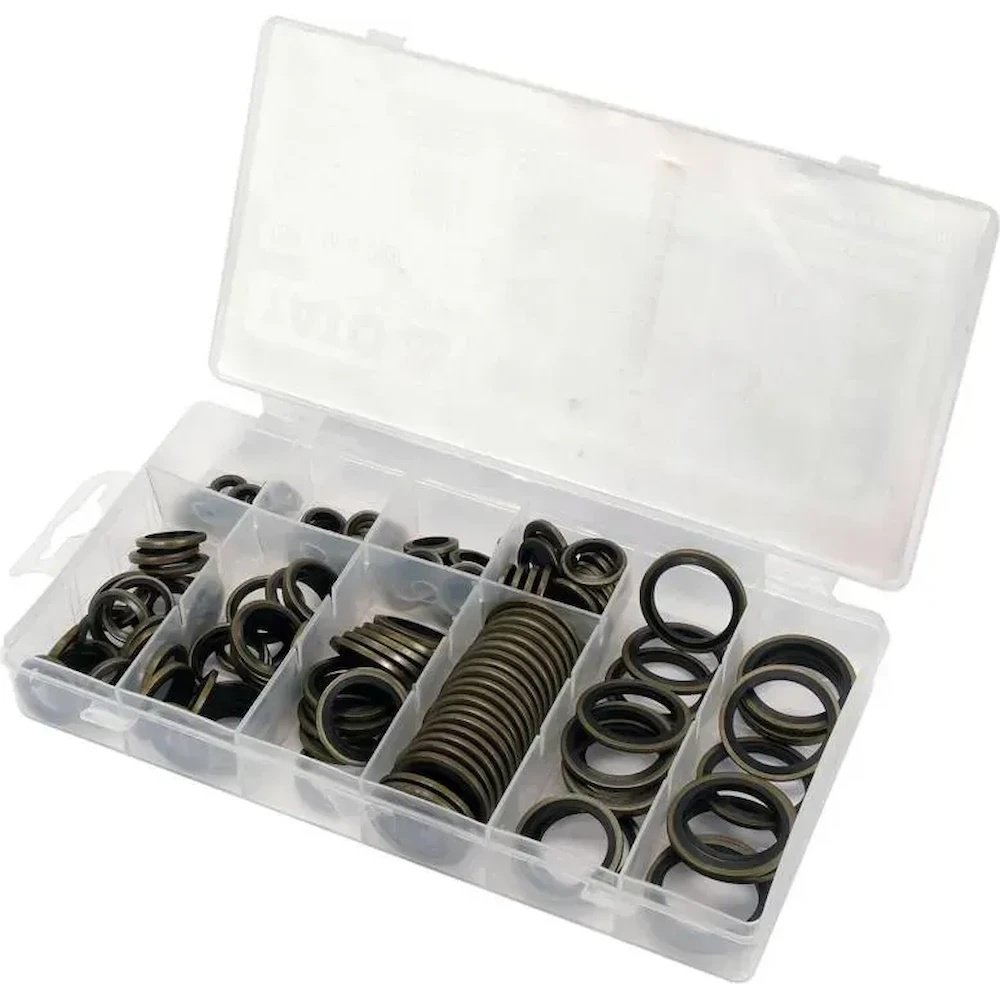 Include șaibe: câte 20 buc.: M12 x 1,9 mm, M14 x 1,9 mm, M16 x 1,9 mm, M18 x 1,9 mm, M20 x 1,9 mm. câte 10 buc.: M6 x 1 mm, M8 x 1,9 mm, M10 x 1,9 mm, M22 x 1,9 mm, M24 x 1,9 mm. Material: oțel și cauciuc NBR 70.