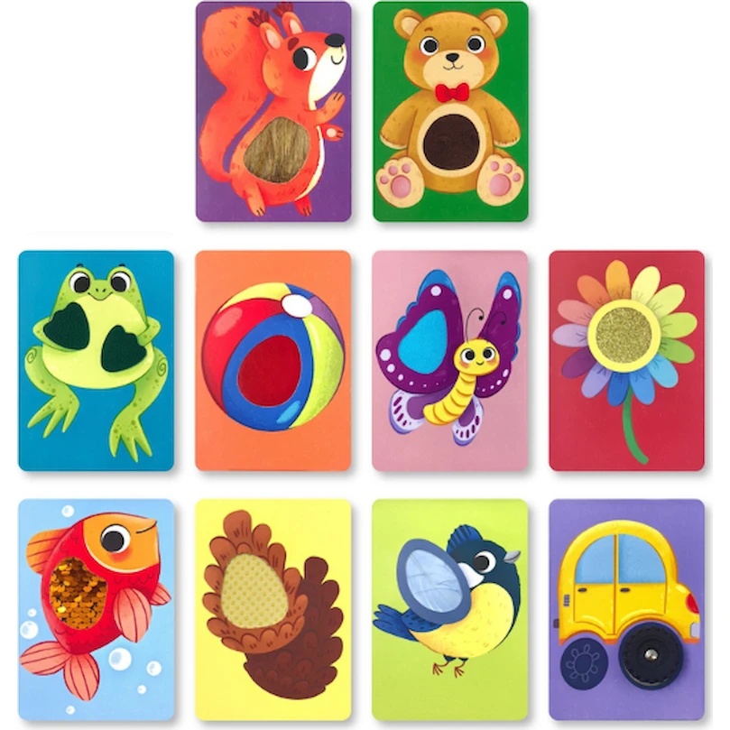 Include 10 carduri tactile mari (dimensiunea unui card 14×10 cm) cu texturi care stimulează dezvoltarea senzorială, motricitatea fină și sensibilitatea tactilă, ajutând în același timp copiii să își extindă vocabularul într-un mod captivant și distractiv.
