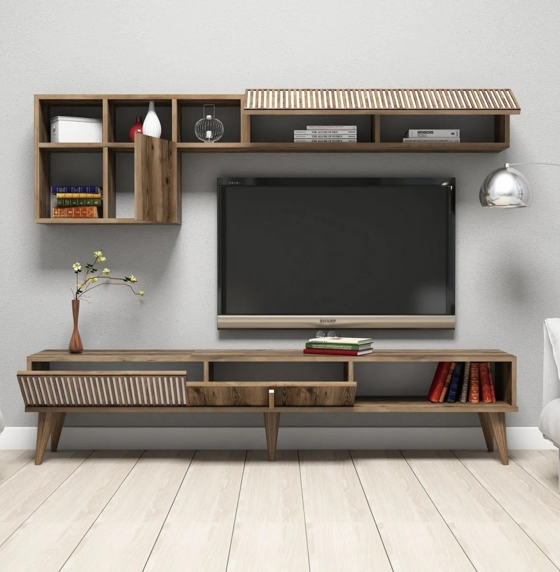 Suportul TV cu lățimea de 180 cm oferă spațiu suficient pentru articolele dedicate divertismentului. Raftul de perete, tot de 180 cm, adaugă rafinament și extinde opțiunile de depozitare. Măsuța de cafea, cu o suprafață generoasă, este potrivită atât pentru întâlniri relaxante, cât și pentru seri plăcute în familie.