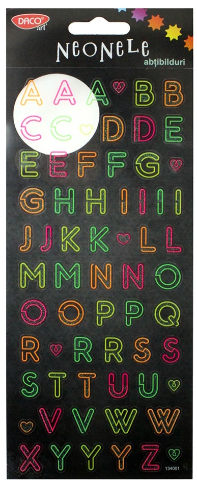 Setul conține 1 coală de 10 cm x 23 cm, cu litere autoadezive într-o paletă vibrantă de culori neon. Abțibildurile sunt ideale pentru a crea mesaje personalizate, titluri sau inițiale, oferind un efect spectaculos pe orice suprafață.