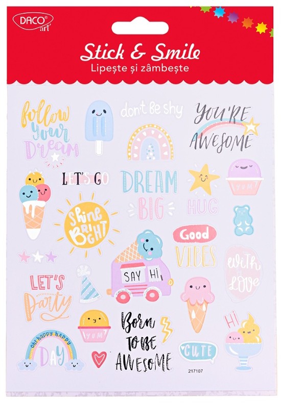 Realizate din hârtie, aceste abțibilduri sunt ideale pentru decorarea agendelor, jurnalelor, felicitărilor, invitațiilor sau altor obiecte de papetărie. Fie că le folosești pentru a-ți personaliza spațiul de lucru, pentru a decora un cadou sau pentru a crea un colaj creativ, designul jucăuș și mesajele pozitive te vor încuraja să vezi partea frumoasă a fiecărei zile.