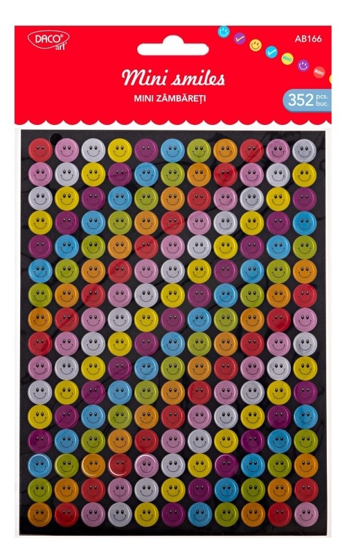 Abțibildul AB166 Mini zâmbăreți DACOart este un accesoriu vesel și colorat, ideal pentru a adăuga o notă de bucurie și personalitate oricărui proiect creativ. Aceste abțibilduri din hârtie sunt perfecte pentru copii și adulți deopotrivă, oferind o modalitate simplă și distractivă de a decora diverse obiecte.