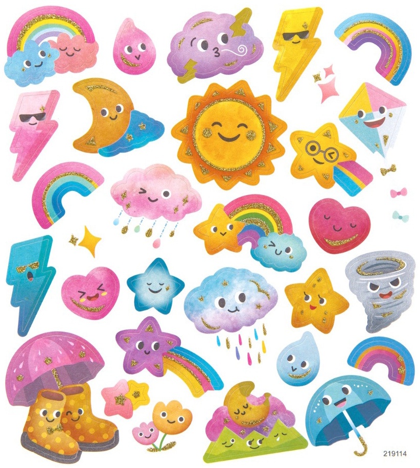 DPCraft Weather 30 pcs (DPNK‑139) este un set de 30 de stickere decorative cu sclipici care ilustrează diverse fenomene meteorologice, cum ar fi soarele, norii, picăturile de ploaie, curcubeul, umbrelele și motive similare.