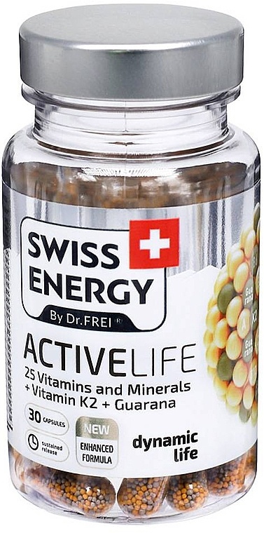 vitamina A, vitamina C, vitamina D, vitamina E, vitamina K2, tiamină, riboflavină, niacină, vitamina B6, acid folic, vitamina B12, biotină, acid pantotenic, calciu, fier, fosfor, iod, magneziu, zinc, seleniu, cupru , extract de mangan, crom, molibden, potasiu, guarana.