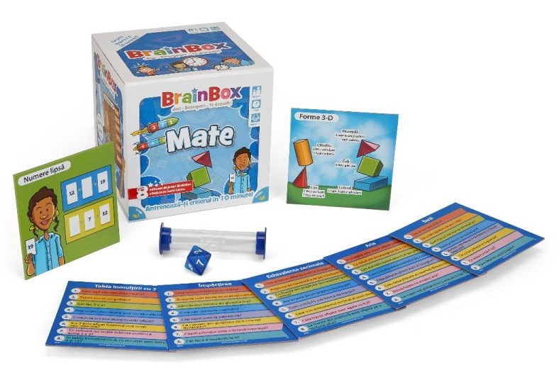 BrainBox Mate - Joc distractiv, educativ, copii peste 8 ani (nivel cheie 2) BrainBox este joc de carti distractiv de memorie si observare, testând atentia la detalii. Ce iti poti aminti in doar 10 secunde? Aceasta editie de joc pentru matematica va contribui la dezvoltarea abilitatilor de calcul ale copilului tau. BrainBox Matematica contine 55 de carti de joc bazate pe programa scolara, reprezentând diferite elemente de matematica, de la inmultire la fractii, ora, grafice si multe altele. Fiecare carte de joc prezinta ilustratii desenate de mâna, pentru a contribui la explicarea elementului din programa scolara de matematica prezentat cu mai multe exemple. Jocul ii ajuta pe copii sa-si dezvolte abilitatile de calcul si, cel mai important, increderea la matematica, dezvoltându-le in acelasi timp abilitatile cognitive de observare si de reamintire, care stau la baza invatarii pe tot parcursul vietii.