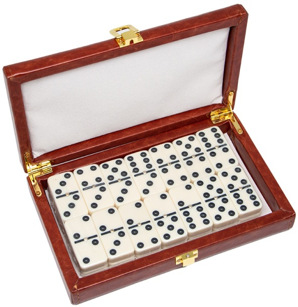 Acest domino este un set standard de 28 de plăci care au un aspect tradițional - o față despicată cu un anumit număr de puncte și „spate” identice. Degetele sunt realizate din plastic de înaltă calitate, care se caracterizează printr-o durabilitate extremă. Datorită acestui fapt, ei sunt capabili să reziste aproape oricărui impact asupra mesei, ceea ce se întâmplă adesea în plin joc. Este prevăzută o cutie compactă îngrijită pentru depozitarea zarurilor.