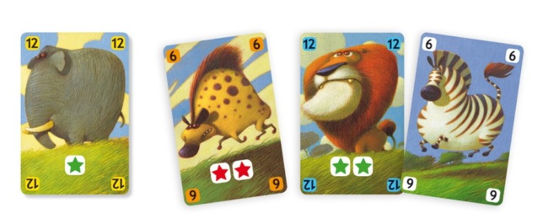 In set48 de cărți: 12 cărți de elefant, 12 cărți de leu, 12 cărți de hienă și 12 cărți de zebră