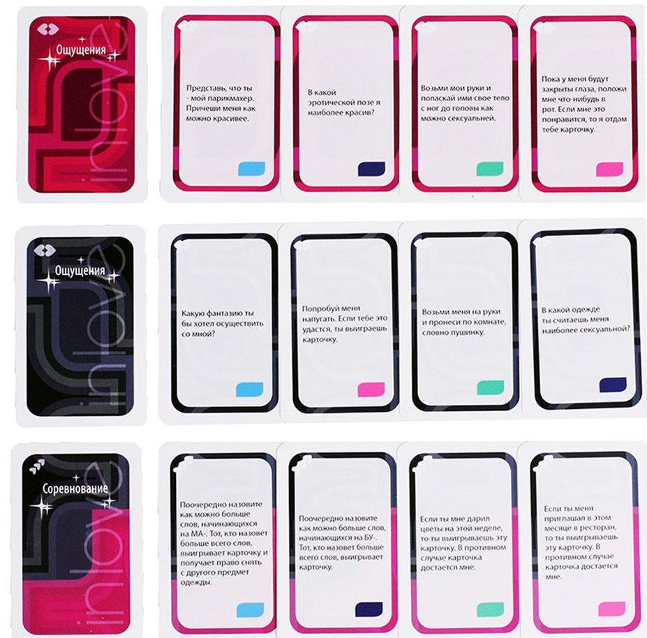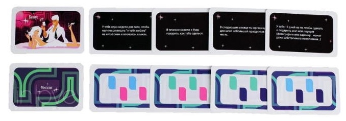 In set60 de cărți „Competiție” pentru doi, două pachete de cărți cu sarcini pentru el și pentru ea (35 cărți „Sentimente”, 35 cărți „Relație” și 35 cărți „Gândire”), 10 carduri de misiune, 20 de carduri bonus, cub cu inimioare, cadru magnetic pentru frigider, cutie de cărți (cu spațiu pentru aruncarea zarurilor), regulile jocului