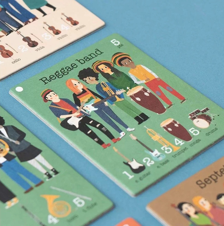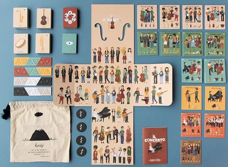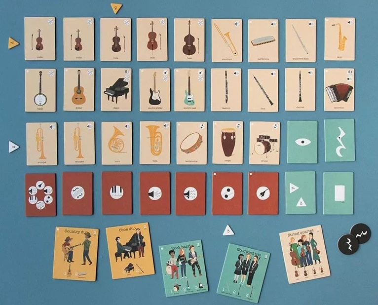In set36 de cărți, 20 de cartonașe cu grupuri muzicale, 4 jetoane de tăcere, 24 de jetoane - jetoane de coordonare