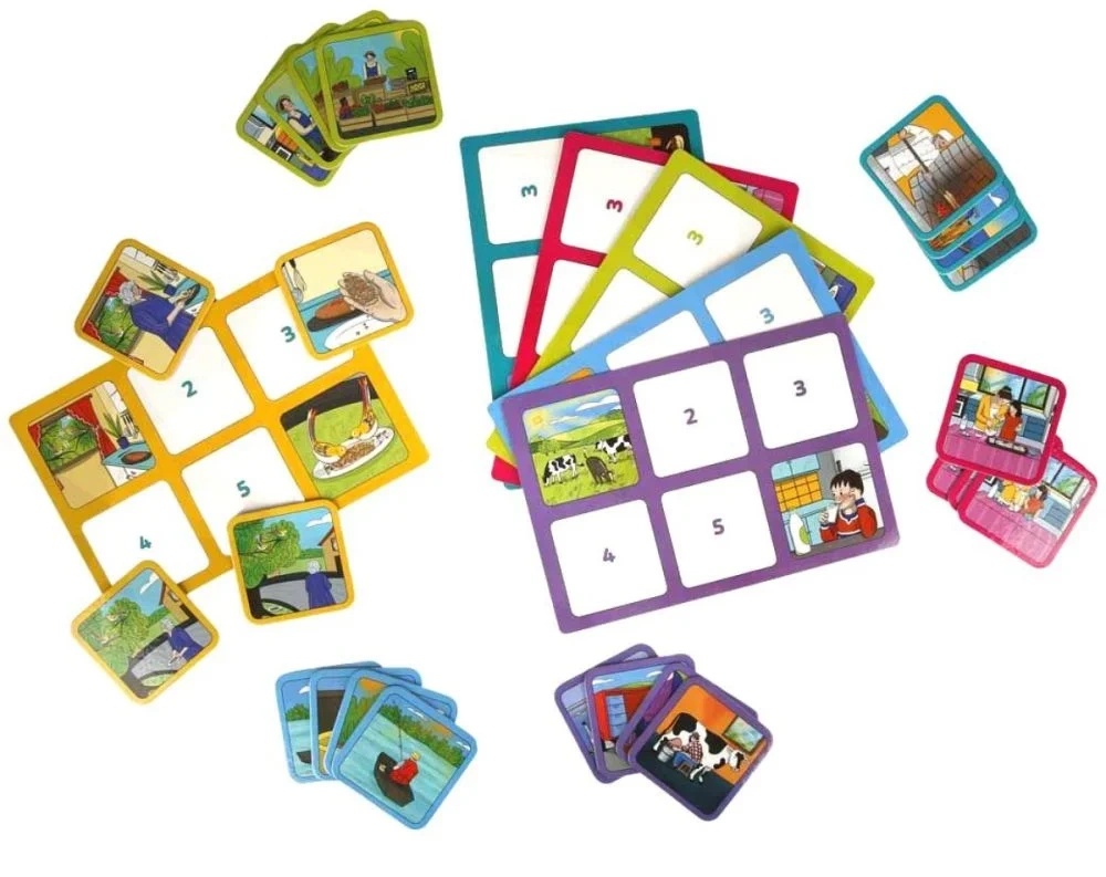 Jocul contine 6 povesti diferite. Fiecare poveste este incadrata intr-un chenar de culoare diferita. Povestile sunt completate de patru cartonase patrate. De exemplu, pentru a completa povestea portocalie, cartile patrate portocalii sunt plasate in conformitate cu povestea, cu referire la primul si ultimul cadru. Completand povestile, copii reusesc sa invete mult mai rapid.