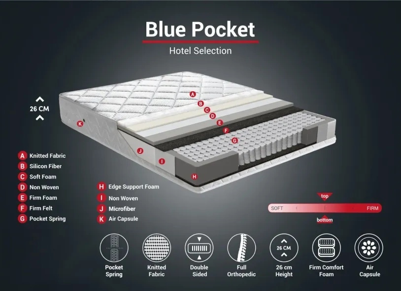 Confort complet pentru ani de acum încolo! Salteaua Blue, cu structura sa complet ortopedică, împrumutată de la sistemul multi-arc Niron, își menține forma din prima zi de utilizare ani de acum încolo; datorită materialului natural tricotat, te vei trezi odihnit. Cu o înălțime de 26 cm, materialul natural tricotat și umplutura din silicon matlasat oferă un confort ideal pentru cei care preferă o saltea fermă. Salteaua Blue este reversibilă datorită structurii sale ergonomice.