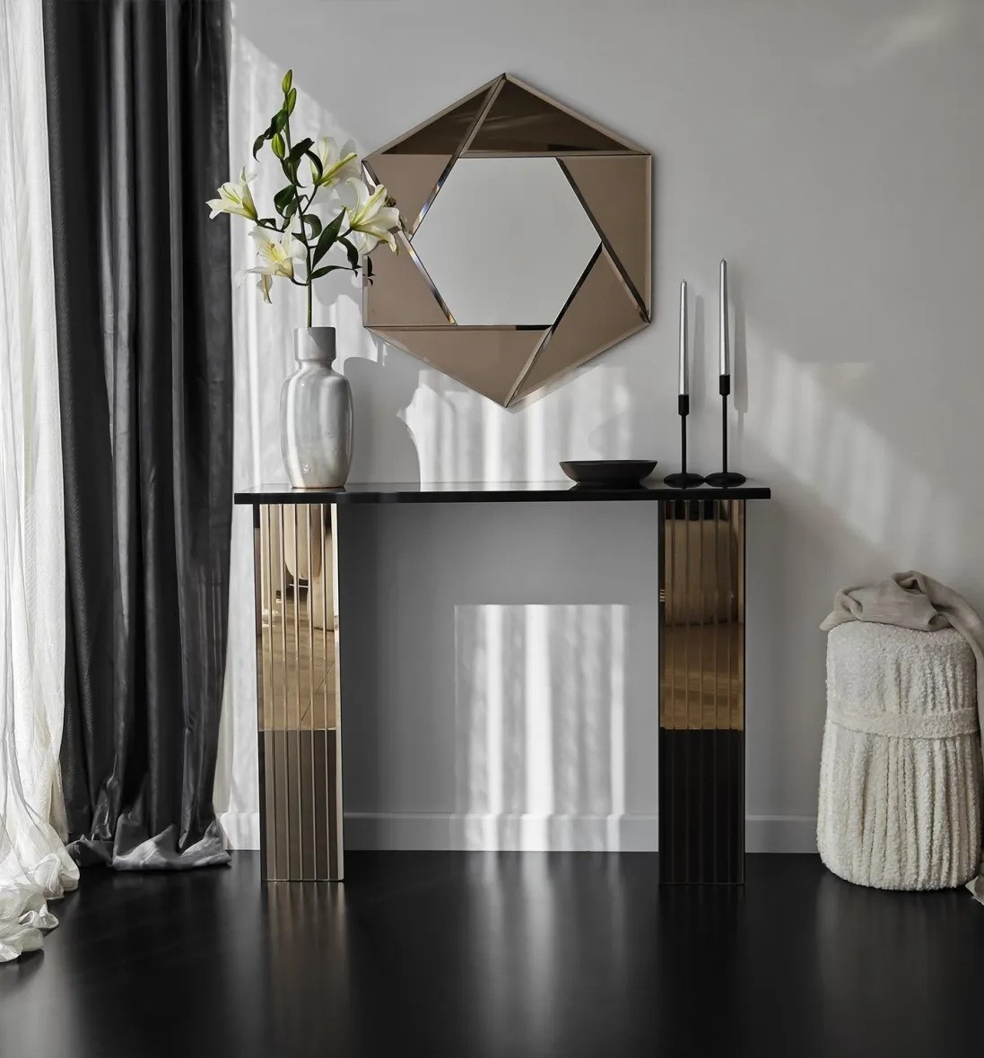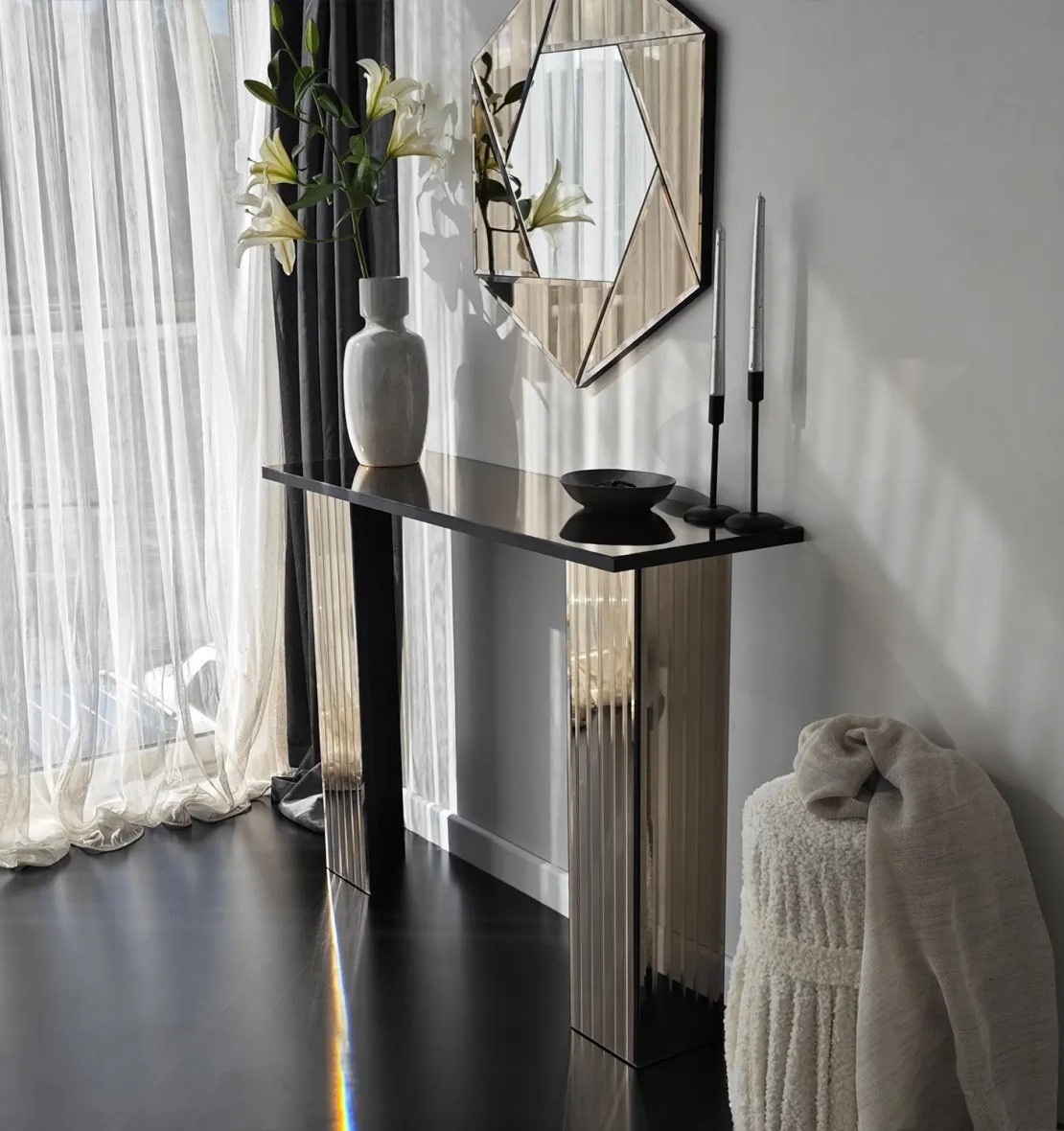 Designul minimalist include o singură poliță, perfectă pentru organizarea obiectelor esențiale sau pentru a expune decoruri. Finisajul neted și atent lucrat asigură un aspect modern și rafinat, potrivit pentru dormitor sau living.