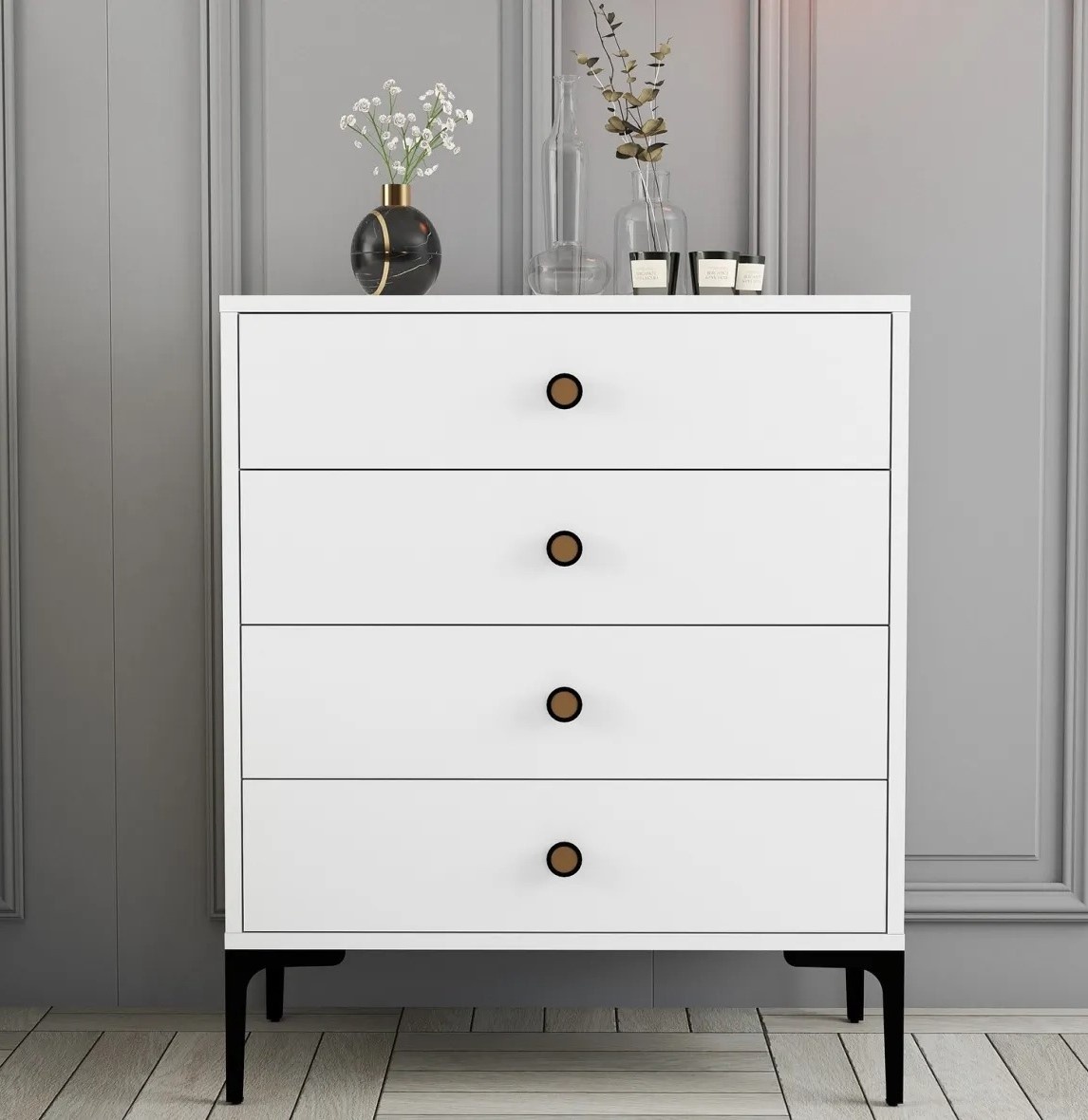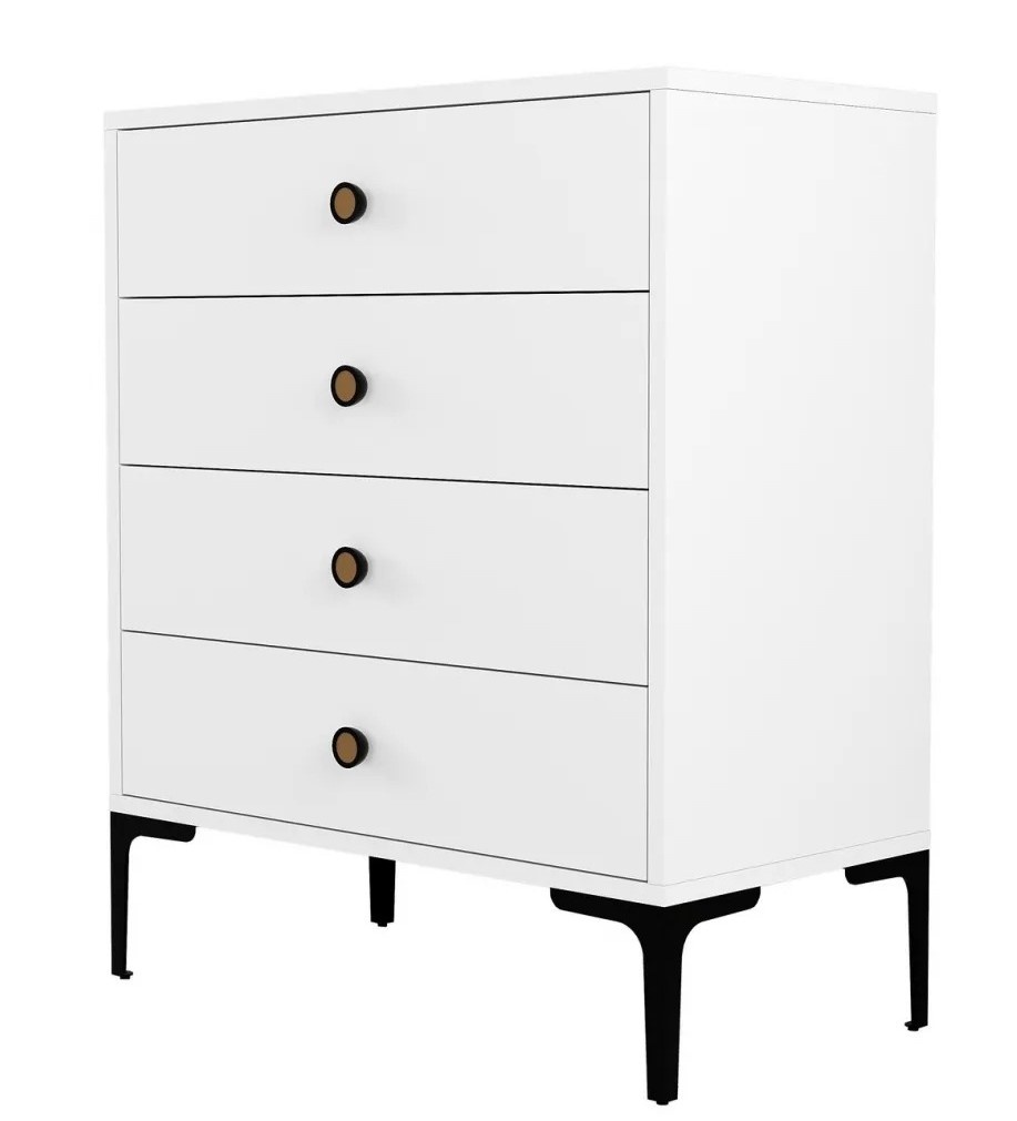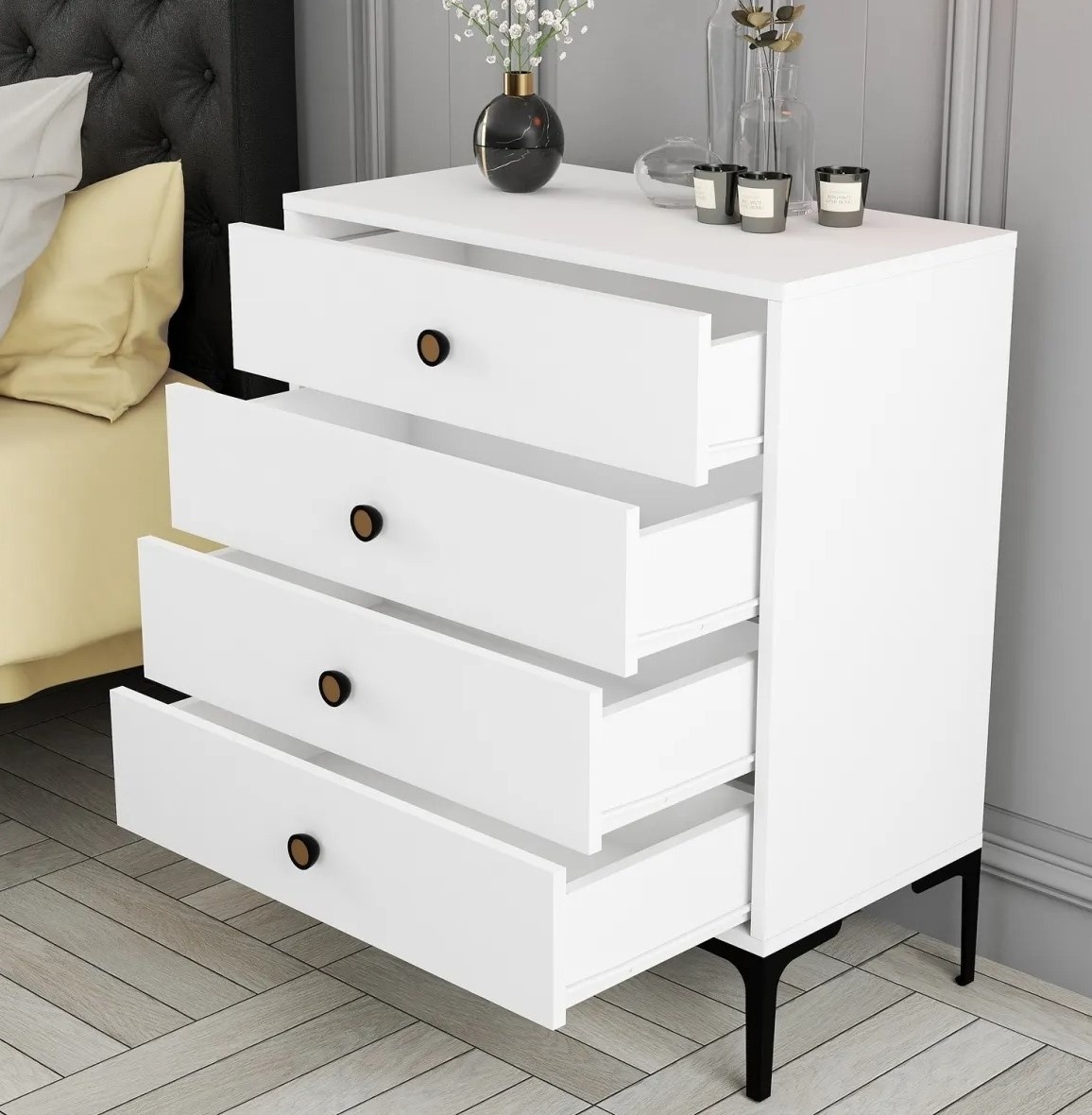 Cu patru sertare spațioase, această comodă oferă un spațiu amplu de depozitare pentru toate lucrurile tale esențiale. Fie că este vorba de haine, accesorii sau alte obiecte, puteți păstra cu ușurință totul organizat și la îndemână. Mânerele din plastic adaugă comoditate și facilitează deschiderea și închiderea sertarelor.