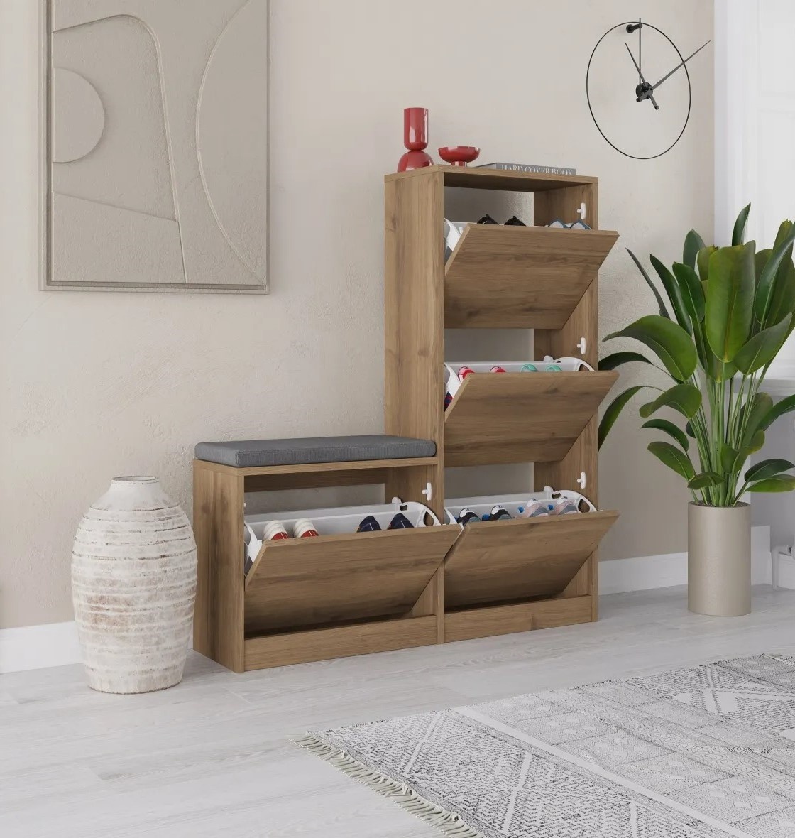 Cu dimensiunile de 105 cm lățime, 118,5 cm înălțime și 26 cm adâncime, dulapul oferă spațiu generos pentru toate perechile de pantofi. Designul inteligent include mai multe rafturi și compartimente, permițând organizarea ordonată a încălțămintei și acces facil la fiecare pereche. Găsirea pantofilor potriviți devine rapidă și ușoară.