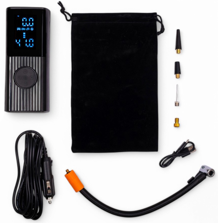 Комплектация: насос, 4 насадки (FV-AV, игла, 2 конические), воздушный шланг, кабель USB-C, автомобильный кабель 12 В