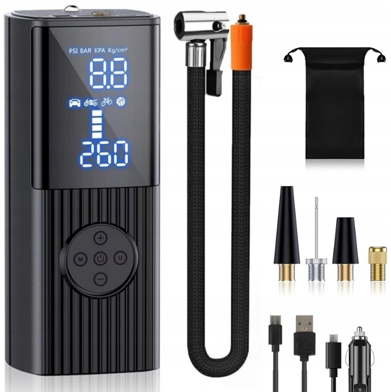 Изготовленный из прочных материалов, насос компактен, лёгок (помещается на ладони) и имеет стильный дизайн. Благодаря зарядке через USB-C и автомобильному разъёму 12 В он всегда готов к использованию. В комплект входит полный набор аксессуаров: воздушный шланг, четыре различных насадки для накачивания (FV-AV, игла, конические), кабель USB-C и автомобильный кабель для зарядки. С аккумуляторным электрическим насосом inSPORTline Dukefira вас больше никогда не застанет врасплох прокол колеса.