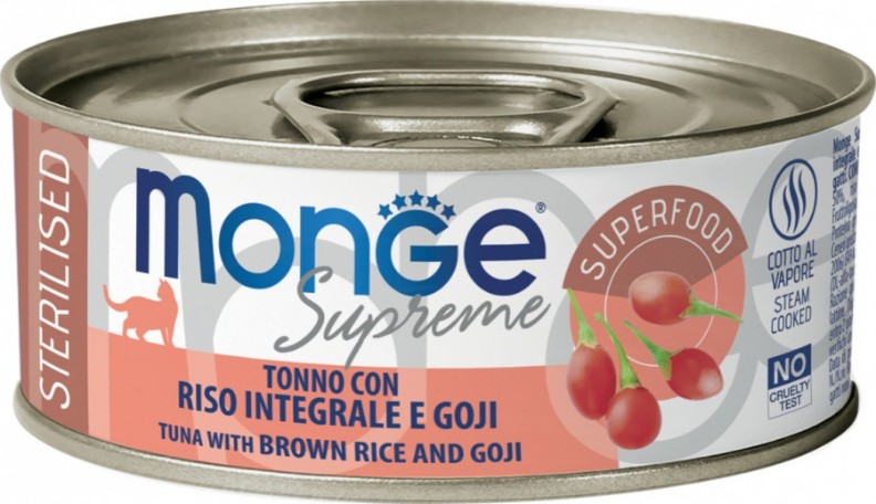 Hrană umedă pentru pisici Monge Supreme Sterilised Tuna/Rice/Goji 80g