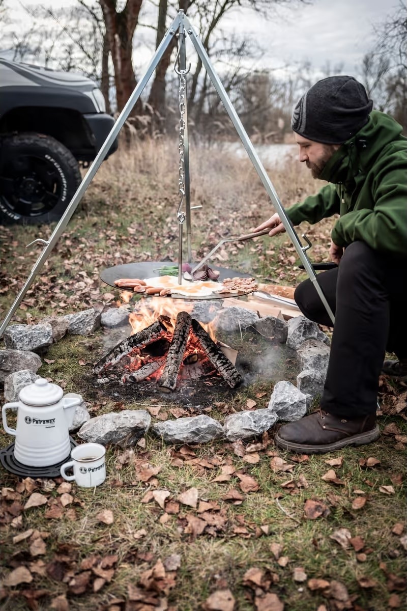 Petromax Hanging Fire Bowl for Cooking Tripod — castron atârnat pentru gătit la foc deschis. Cu ajutorul tijei cu ochiuri, bolul poate fi atârnat ușor și sigur de cârligul de pe trepied. Oțelul folosit la fabricarea tigăii se încălzește rapid până la temperatura dorită. Iar cu ajutorul lanțului de pe trepied, puteți regla înălțimea la care este atârnat vasul, ceea ce va afecta timpul de gătire. Carnea se va frige ușor datorită bulionului și sucului rămas în castron. Acest bol are, de asemenea, diferite zone de temperatură, care vă permit să prăjiți fileuri în centru și să gătiți ușor legumele sau să mențineți mâncarea caldă pe margine. Cu un diametru de 56 cm, puteți hrăni o familie numeroasă cu o mare varietate de feluri de mâncare în aer liber.