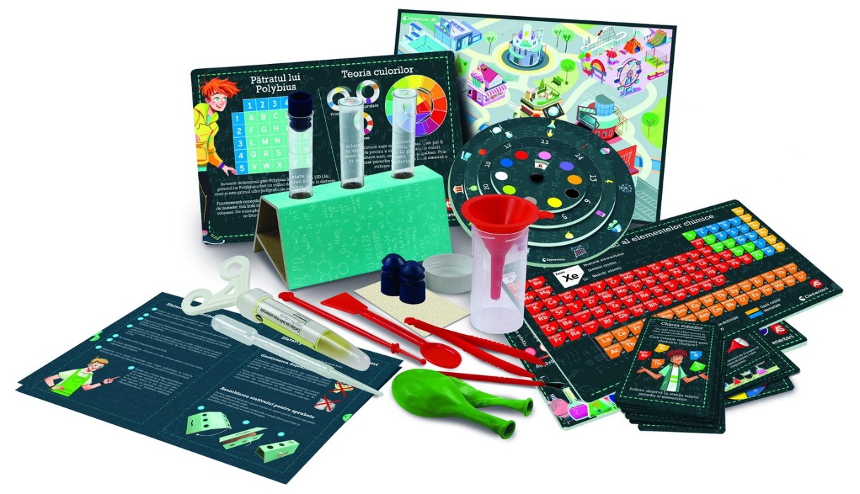 Stiinta devine si mai distractiva cu acest set de stiinta care combina lumea chimiei cu cea a misterului! Vrei sa afli despre experimentele de chimie si despre toate secretele din spatele crearii lor? Acum poti, prin acest set stiintific si cu instrumentele speciale, sa faci multe experimente simple si sigure si sa creezi un adevarat laborator in casa ta! Setul include tot ce aveti nevoie pentru experimente in amestecuri, filtrari si PH, datorita hartiei cu pH. Setul include si palnie, hartie de filtru, spatula, tabel periodic si multe altele.
