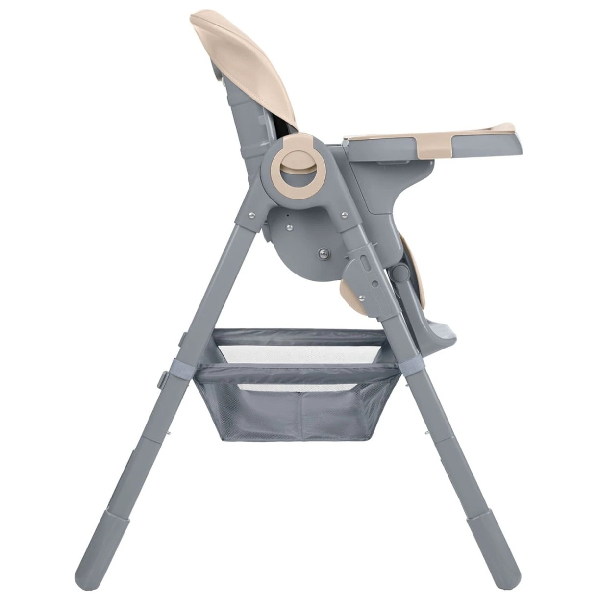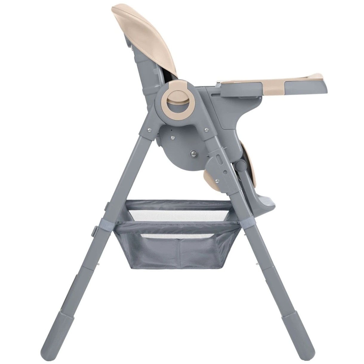 - Un coș de depozitare util situat sub scaun oferă locul perfect pentru a depozita jucării, bavețici sau accesorii de hrănire, păstrând esențialele la îndemână în timpul meselor.