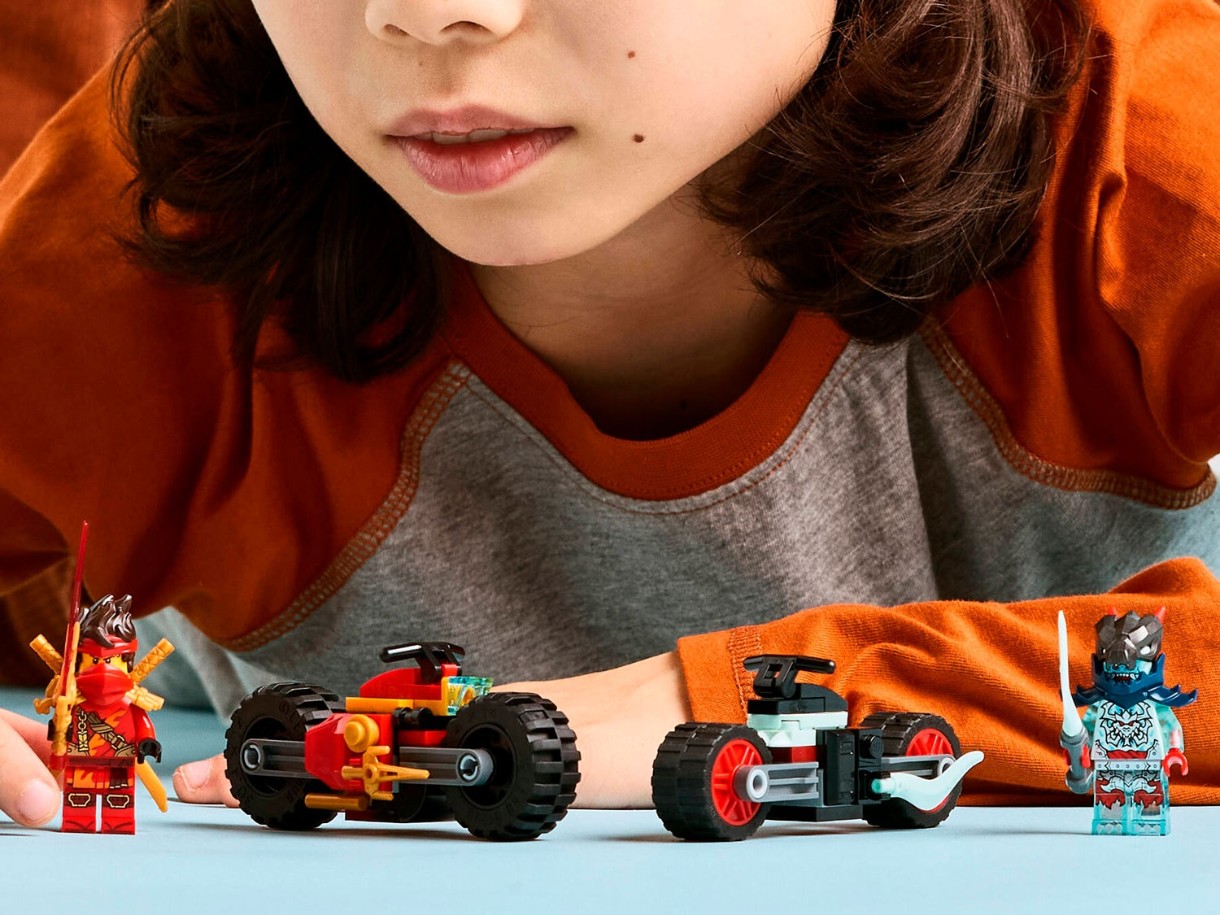 Setul de joacă Kai Speed Bike Racing (71838) permite băieților și fetelor cu vârsta de 6 ani și peste să recreeze scene pline de acțiune din sezonul 3 al serialului TV NINJAGO®, Rise of the Dragons. Acest set de luptă cu biciclete plin de acțiune include 2 biciclete ninja cu roți mobile: bicicleta de curse a lui Kai, împodobită cu două pumnale, și bicicleta demonică a ticălosului Cercetaș Dragon Spectral.