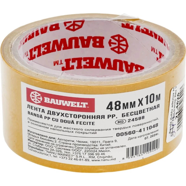 Banda dublu adezivă Bau Welt din polipropilenă (PP), cu lățimea de 48 mm și lungimea de 10 m, este destinată lipirii ferme a suprafețelor dure. Ideală pentru montarea pardoselilor și fixarea elementelor de interior.