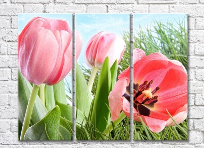 Pictură Rainbow Huge flowers of pink tulips on a background of grass (500472)